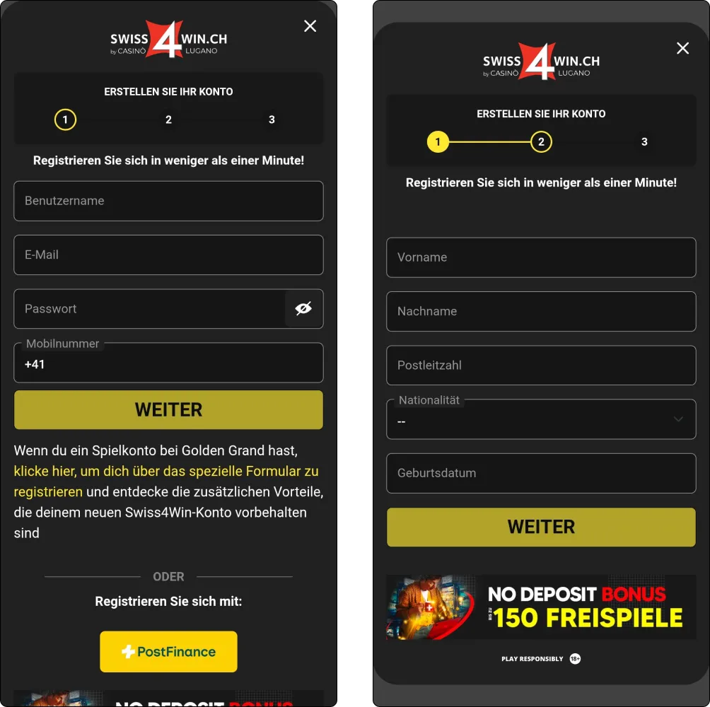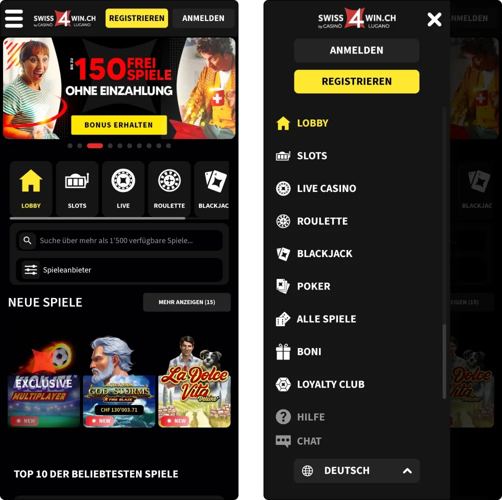 Swiss4Win bietet eine vollständige Mobile-Lösung für Schweizer Spieler. Die Website passt sich automatisch an alle Bildschirmgrössen an und funktioniert auf allen gängigen Smartphones einwandfrei.