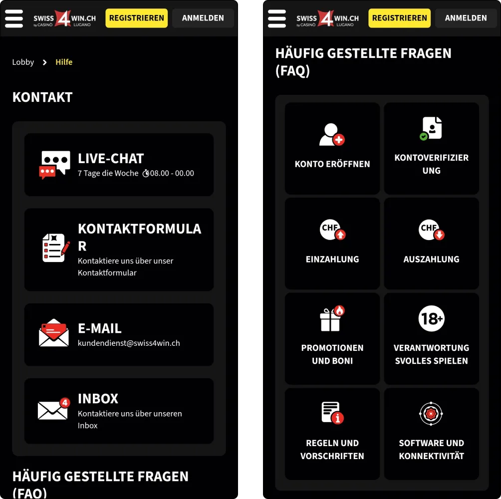 Der Kundendienst bei Swiss4Win ist mehrsprachig aufgestellt und bedient Schweizer Spieler in Deutsch, Französisch und Italienisch. Die Qualität des Supports entspricht dem Standard des traditionsreichen Casinò Lugano.