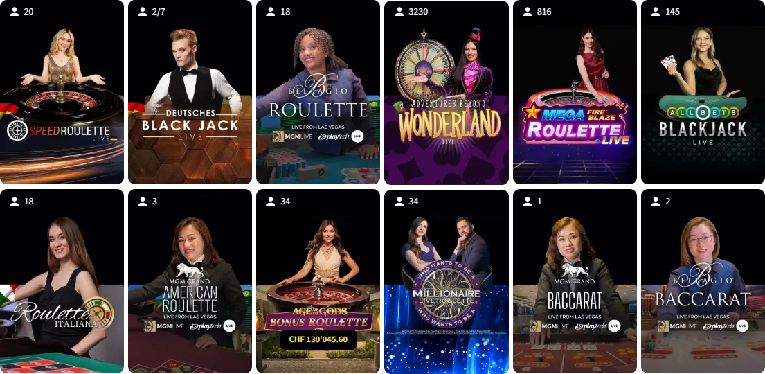 Die Tischlimits reichen von CHF 1 bis CHF 10’000, sodass sowohl Gelegenheitsspieler als auch High Roller auf ihre Kosten kommen. Besonders beliebt: Die Immersive Roulette mit mehreren Kamerawinkeln und Zeitlupen-Wiederholungen.