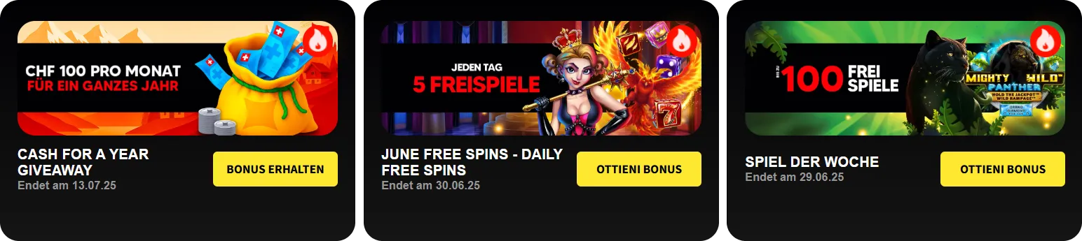 Der Geburtstagsbonus und wöchentliche Reload-Angebote runden das Portfolio ab. Prüfen Sie Ihre Inbox regelmässig – viele Aktionen werden individuell verschickt.