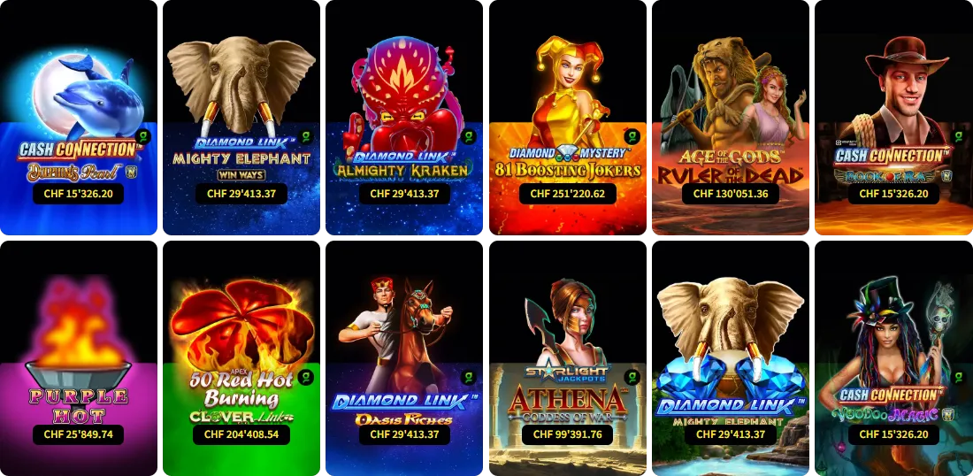 Die Slots-Sammlung umfasst alle wichtigen Kategorien. Klassische Früchteslots wie Lucky Lady’s Charm Deluxe treffen auf moderne Video-Slots wie Gates of Olympus. Besonders beliebt bei Schweizer Spielern sind: